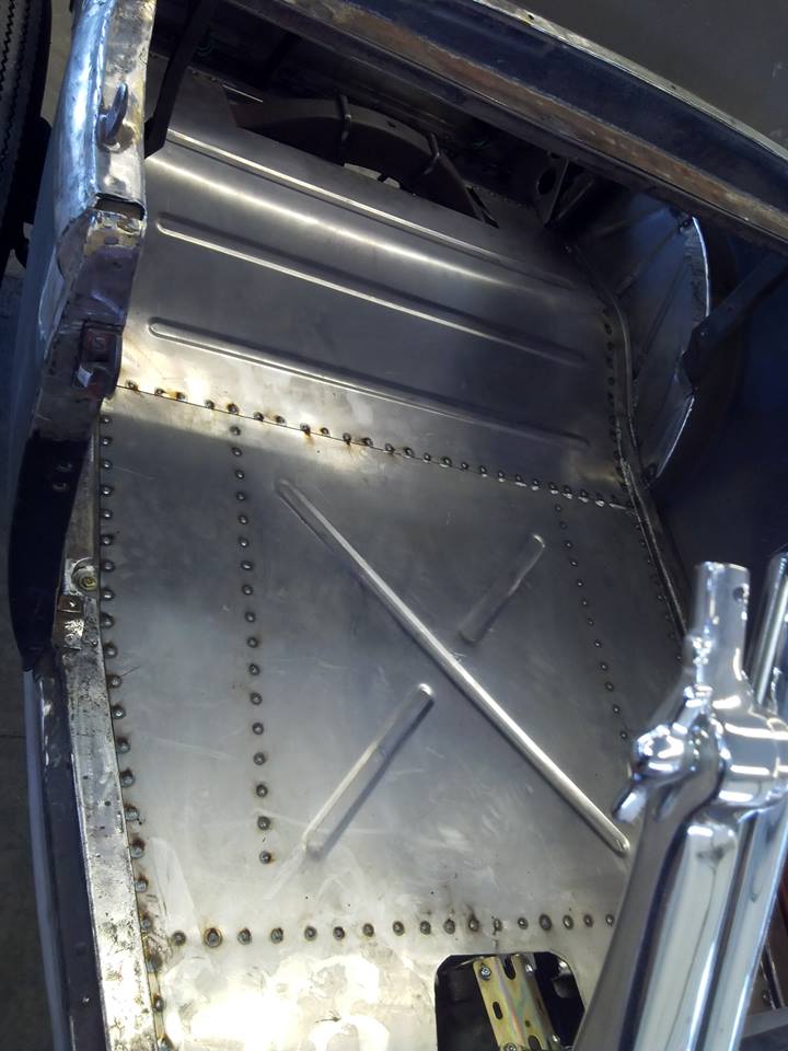 Centered up the body in the wheel well and put the wells in, fired up the pullmax and made a new floor, welded her in. Will do the spring cover firewall and tranny tunnel next week. Chris Beavers roadster will be a nice piece
